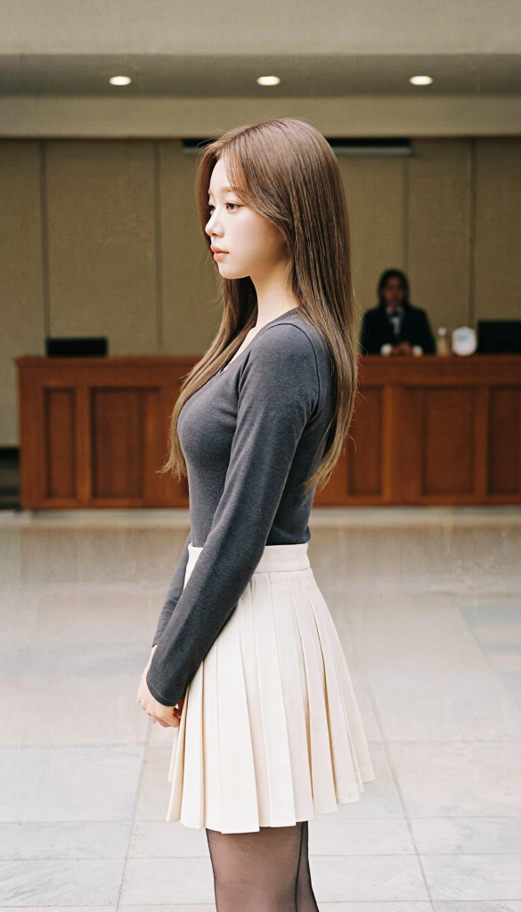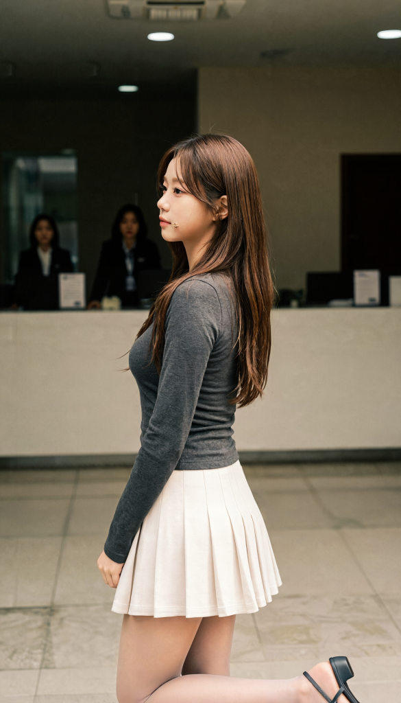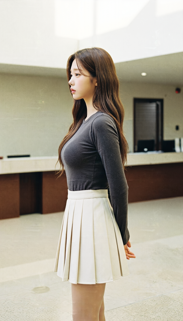 Empty lobby, just me and my side profile—didn’t even try but this photo feels like a scene from an indie filmㅠㅠ Gray top, beige pleated skirt, staring into the distance… and somehow it looks lonely yet warm at the same time.