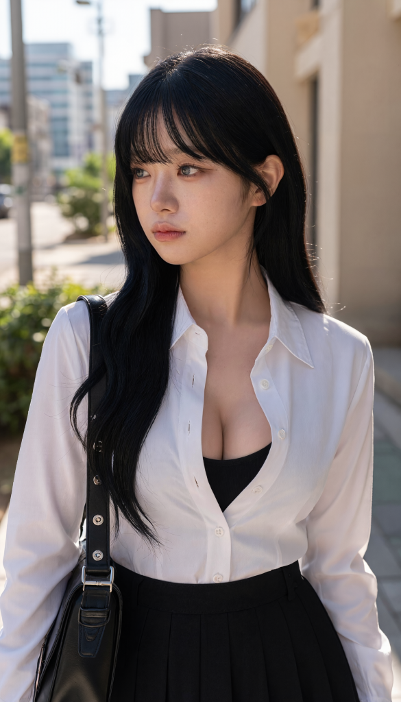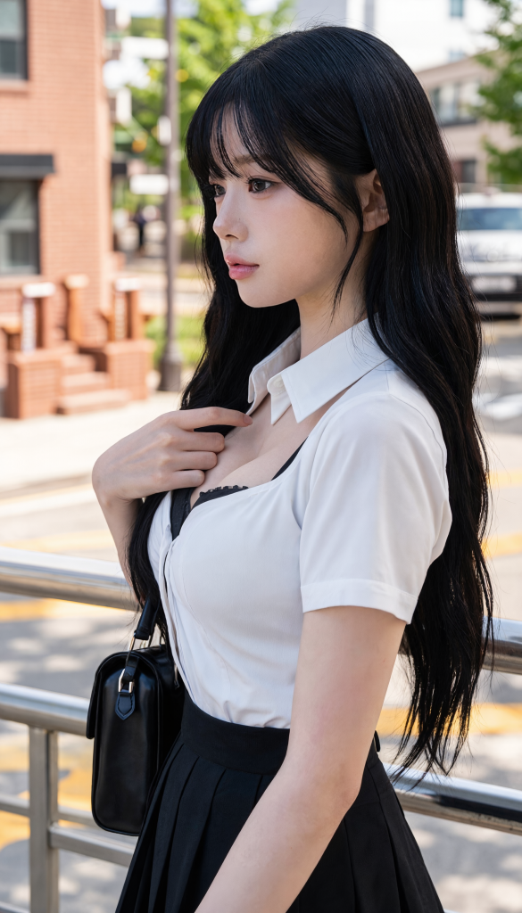 White shirt, black pleated skirt, bag resting on my lap, just standing there catching the breeze… but looking at this photo feels so fresh and tenderㅠㅠ Sunlight gently touching my face, wind slipping through my hair—the moment looks so pretty I kept staring. Life’s been hectic lately, but pausing like this brings back that young, innocent feeling. Sometimes putting on something like a uniform and just feeling the wind is the best kind of healing. You’ve all worked hard today… take a second to smile thinking of old days, like I am ˗ˏˋ ♡ ˎˊ˗